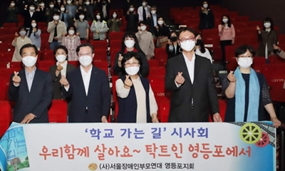 ‘학교 가는 길’은 먼 곳에 있는 학교에 가야 하는 장애 아이들을 위해 두 팔을 걷어붙이고 나선 부모들의 용기 있는 행보를 담은 다큐멘터리 영화다. 강서 특수학교인 서진학교의 개교를 위해 무릎까지 꿇는 강단과 용기, 그리고 학부모들의 연대를 통해 사회의 차별을 딛고 일어서려는 어머니들의 의지, 세상의 차별에 굴복하지 않고 맞서 싸우는 장애 학생 어머니들의 위대함을 보여주는 다큐멘터리 영화 ‘학교 가는 길’은 오는 5월 5일 개봉될 예정이다. 이날 시사회에 참석한 정순경 영등포구장애인가족지원센터장은 “이 영화는 특수학교 설립에 관한 건조한 기록물이 아니다”라며 “발달 장애인과 그 가족이 사는 이야기, 세상의 편견이나 오만과 싸워가는 엄마들의 이야기, 그러면서 세상이 변해가는 이야기를 담고 있는 무척 깊고 큰 영화다”라고 강조했다. 정순경 센터장은 이어 “특수학교 이야기를 넘어서 장애가 있는 모든 이들, 그 모든 가족의 이야기다”라며 “부디 우리 이웃이, 세상 사람들이 영화를 많이 보아주었으면 좋겠다”라고 밝혔다. 정순경 센터장은 “ 장애로 시작된 영화지만 사람으로 마무리된다”라며 “무릎을 꿇어 바꾸었던 세상에 우리들의 이야기를 담은 이 영화가 다시 또 뜨거운 온기를 더하기를 바란다”라고 덧붙였다. ‘학교 가는 길’은 제12회 DMZ 국제다큐멘터리영화제 개막작이자 제25회 인천 인권영화제 폐막작으로 17년 동안 멈춰 있던 서울 시내 신규 특수학교 설립을 끌어낸 장애 학생 부모들의 사연을 통해 더불어 사는 세상에 대한 희망을 제시했다는 평가다. 이날 시사회에는 영등포구 장애인체육회, 여성단체협의회, 장애인복지관 관계자와 채현일 영등포구청장, 고기판 영등포구의회 의장, 양민규 시의원, 정순경 장애인가족지원센터장 등 80명이 참석했다.