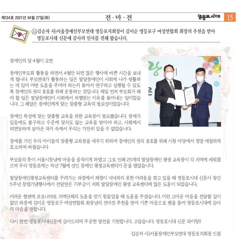 김순자 사)서울장애인부모연대 영등포지회장이 김미순 영등포구 여성연합회 회장님의 추천을 받아 영등포시대 신문에 감사의 인사를 전해 왔습니다.