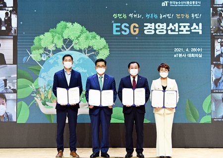 한국농수산식품유통공사(사장 김춘진)는 28일 aT유튜브 공식 채널을 통해 지속가능한 농어업 실현을 위한 ‘aT ESG경영 선포식’을 개최했다. 이번 선포식은 ▲지구를 살리는 지속가능한 농어업 지원 ▲농어민과 만드는 국민 행복먹거리 ▲국민에게 신뢰받는 투명한 aT를 목표로 사회적가치를 실현하고자 ESG경영을 선포하고 이를 대내외에 공유하기 위해 마련된 자리이다. 선포식에서는 aT 사장·감사·노조위원장·고객사 대표가 한 마음으로 ▲안전한 먹거리 순환 체계를 조성하는 녹색경영 실천 ▲국민·농어인·근로자 모두의 가치 존중 ▲지역경제 활성화와 사회적 약자 지원 ▲윤리와 인권을 지키고 국민과 소통하는 투명경영 실현 등의 실천 과제가 담긴 ‘ESG경영 선언문’을 낭독하고, 실천 다짐으로 서약서를 제출한 169개의 농수산식품기업을 소개했다. 또한 김효준 前한독상공회의소 회장을 초청하여 ‘ESG 경영트렌드와 공공기관의 사회적가치’ 주제로 특별강연을 개최하고, ESG경영 동반성장 우수협력사 장기 재직직원인 유엔세계식량계획 임형준 한국사무소장 등 13명을 포상했다. 그리고 안전한 먹거리로 농어민의 행복과 국민건강을 책임지는 ‘aT ESG경영 2025 전략방향과 주요 부문별 추진계획’을 설명하는 순서로 진행됐다. aT는 선포식에서 ESG 경영이 미래세대를 위한 지속가능한 농어업 실현의 필수전략임을 확인하고, 정책 실행의 모든 범위에 걸쳐서 환경 ‧ 사회책임 ‧ 투명성 등 사회적가치의 중요성을 인식하여 지구를 살리는 활동에 앞장서기로 하였다. 김춘진 한국농수산식품유통공사 사장은 “aT는 2025년까지 ESG경영 실천 과제를 통한 먹거리 복지 확대로 상생과 동반성장에 앞장서며, 국민 먹거리를 안전하게 안정적으로 공급하여 식량안보에 대응함으로써 공공기관의 역할과 책임을 다하겠다”고 밝혔다.