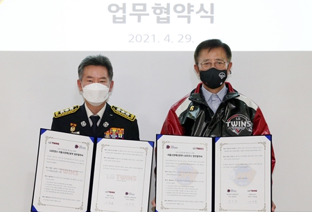 서울시는 서울소방재난본부와 LG 트윈스는 29일 오후 LG 트윈스 홈구장인 잠실야구장 1층 회의실에서 최태영 서울소방재난본부장과 이규홍 ㈜엘지스포츠 대표이사가 참석한 가운데 시민안전문화 확산을 위한 업무협약을 체결했다고 30일 오전 밝혔다. 서울소방재난본부와 LG 트윈스는 이번 업무협약을 통해 ▲시민 안전의식 향상 및 안전문화 확산을 위한 캠페인 활동 ▲스포츠 경기와 연계한 안전체험 프로그램 및 이벤트 운영 ▲화상환자 지원을 위한 몸짱소방관 희망나눔 달력사업 홍보 등을 위해 상호 적극적으로 협력할 계획이다. 최태영 서울시 소방재난본부장은 “시민 안전을 위해 명문구단인 LG 트윈스와 함께 다채로운 안전 캠페인을 전개해 나가겠다.”며 “안전에 대한 시민 여러분의 관심과 실천을 당부드린다”고 밝혔다.