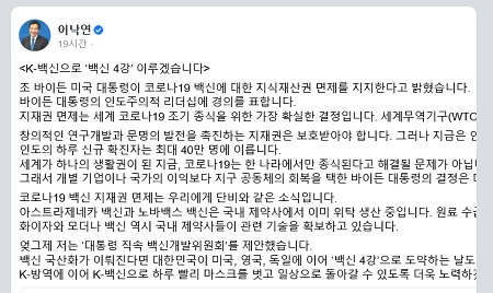 한편 이낙연 민주당 전 대표는 이날 자신의 페이스북에 “K-백신으로 ‘백신 4강’ 이루겠다”며 “지식재산권 면제는 세계 코로나19 조기 종식을 위한 가장 확실한 결정이다”고 적었다.