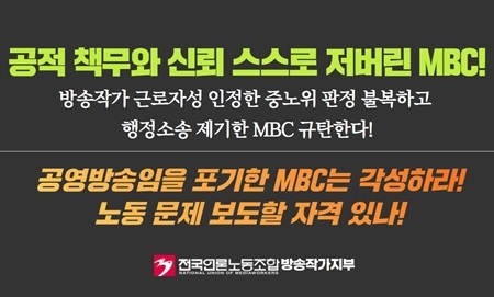 방송작가유니온 “공영방송임을 포기한 MBC는 각성하라!” MBC가 ‘뉴스투데이’ 방송작가 부당해고 사건 중앙노동위원회의 판정에 불복하고 두 작가를 원직에 복직시키고, 해고 기간에 정상적으로 일했다면 받을 수 있었던 임금 상당액을 지급하라는 명령도 지키지 않은 채 4월 6일 행정소송을 제기했다.