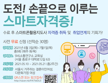 한국여성단체협의회(회장 허명)는 서울시에 거주하는 결혼 이민 여성과 다문화가정 여성을 대상으로 ‘도전! 손끝으로 이루는 스마트자격증!’ 사업을 진행한다고 7일 밝혔다. 서울시의 후원을 받아‘2021년 서울시 성 평등기금 공모사업’으로 진행되는 이번 사업은 서울시에 거주하는 결혼 이민 여성 및 다문화 가정 여성 등을 대상으로 스마트폰 활용 역량 강화를 위해 마련되었다. 사업내용을 살펴보면 취약계층 여성들에게 스마트폰 이용 방법을 교육, 기기 이용과 콘텐츠 제작능력을 고취하여 역량 증대가 필요해짐에 따라 스마트폰 활용 방법 및 이미지 보정 앱 사용 방법 등 기초교육과 캐리커처 만들기, 카드 뉴스, 미러링 시스템 구축 등 심화 교육 등이다. 이번 교육은 서울시에 거주하는 결혼 이민 여성 및 다문화 가정 여성 등을 대상으로 2021년 5월 10일부터 5월 21일 약 2주간 교육 인원을 모집, 6월 3일 (목)을 시작으로 7월 1일 (목)까지 한 달간 SNS소통연구소 교육실에서 진행할 예정이며, 마지막 회차와 수료식은 한국여성단체협의회 2층 강당에서 진행될 예정이다. 교육 신청은 온라인으로만 받으며, http://naver.me/FrKTWDU3에서 할 수 있다. 또한 포스터에 있는 QR코드를 촬영하여 링크로 이동도 가능하다. 허명 한국여성단체협의회 회장은 “코로나 팬데믹 이후로 비대면 활동이 증가하면서 이주여성 및 다문화 여성 등 취약계층 여성들의 디지털기기 사용 역량은 더욱 열악해지는 상황이다”며 아울러 “한국여성단체협의회는 이주여성 및 다문화 여성 등 취약계층 여성들이 경제활동에 활발히 참여할 수 있도록 최선을 다하겠다” 고 말했다.