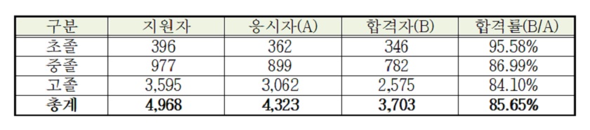 - 4,968명 지원, 4,323명 응시, 3,703명 졸업학력 취득 올해 제1회 검정고시는 4,968명이 응시하여 3,703명이 합격하였으며 합격률은 85.65%를 나타냈다.