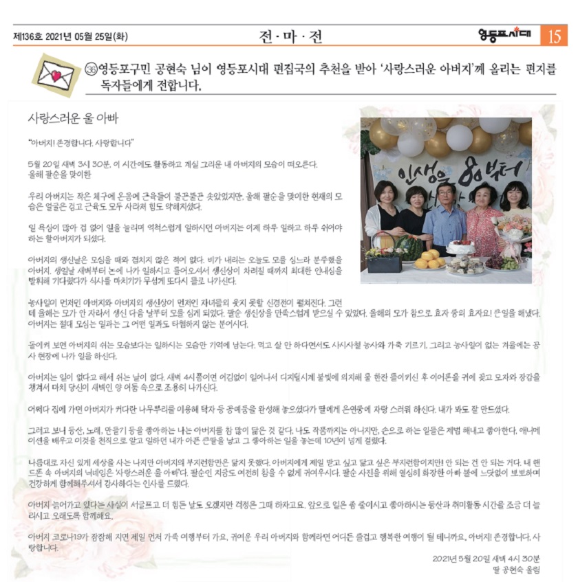 [전마전 136호] 영등포구민 공현숙 님이 영등포시대 편집국의 추천을 받아 ‘사랑스러운 아버지’께 올리는 편지를 독자들에게 전합니다.
