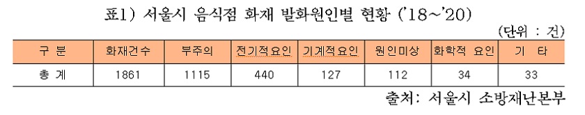 서울시 소방재난본부가 최근 3년간 음식점에서 발생한 화재에 대한 통계를 분석해 5월 28일 발표했다. 소방재난본부 발표에 따르면 최근 3년간 발생한 음식점 화재는 총1,861건으로 연평균 620건 발생하는 것으로 나타났다. 연도별 음식점 화재는 2018년 682건, 2019년 608건, 2020년 571건으로 감소하는 추세이다. 음식점 화재의 발화 원인은 부주의가 1115건(59.9%)으로 가장 많았고 전기적 요인 440건(23.6%), 기계적 요인 127건(6.8%) 등이 뒤를 이었다. 부주의가 원인인 화재는 음식물 조리 중 방치가 520건(46.6%)으로 가장 많았고 이어서 화원방치 216건(19.4%), 가연물 근접 방치 90건(8.1%) 등의 순이었다. 또한 음식점 주방 내 덕트 및 연통에서 발생한 화재가 ’18년 48건, ’19년 50건, ’20년 45건으로 총 143건(7.7%)을 차지하여 각별한 주의가 필요한 것으로 나타났다.