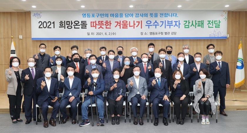 우수기부자 45명 선정, 감사패와 표창 전달 영등포구는 서울사회복지공동모금회와 공동추진한 ‘2021년 희망 온돌 따뜻한 겨울나기’ 사업 평가 결과 우수자치구로 선정되어 서울사회복지공동모금회로부터 표창을 받았다고 3일 밝혔다.