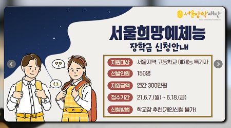 음악, 미술, 체육, 무용 분야에 발전 가능성이 있는 고등학생에게 연간 300만 원의 장학금을 지원하는 ‘서울희망 예체능 장학금’의 신청 대상은 서울 소재 고등학교 재학생 중 예체능(음악, 미술, 체육, 무용)에 재능을 가진 학생으로 중위소득 90% 이하 또는 학교장이 추천하는 저소득층 학생이다. 신청은 학교장 추천을 통해 서울장학재단 홈페이지(www.hissf.or.kr)에서 온라인 접수 후 관련 서류를 우편으로 제출하면 된다. 선발 결과는 8월 중 발표 예정이다. 선발된 장학생 150명에게는 연간 300만 원의 장학금 지원과 함께 전공별 선배 장학생·전문가와의 멘토링 참여 기회를 제공한다. 서울장학재단은 예체능 분야의 미래인재를 양성하기 위해 2012년부터 고교 예체능 장학생을 선발해왔다. 현재까지 1,000여 명의 예체능 장학생에게 총 28억 4천만 원 상당의 장학금을 지원했다.