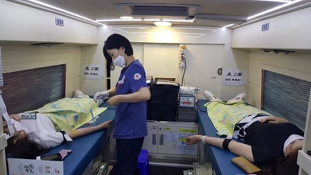 서울지방병무청 직원 20여 명은 9일 병무청 청사 내 제1병역판정검사장 앞에서 병무청을 찾은 헌혈 버스에서 혈액 수급 위기 극복을 위한 단체헌혈에 참여했다.