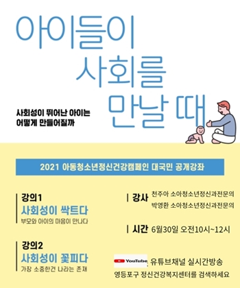 뇌와 함께 자라는 사회성과 영유아기 아동의 사회성 발달, 학령기 청소년의 사회성 정립과 학교폭력 문제를 주제로 한 아동•청소년 정신건강 공개강좌가 열린다.