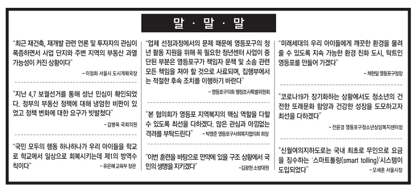 -이정화 서울시 도시계획국장 “지난 4,7 보궐선거를 통해 성난 민심이 확인되었다. 정부의 부동산 정책에 대해 냉엄한 비판이 있었고 정책 변화에 대한 요구가 빗발쳤다” -김병욱 국회의원 “국민 모두의 행동 하나하나가 우리 아이들을 학교로 학교에서 일상으로 회복시키는데 제1의 방역수칙이다” -유은혜 교육부 장관 “미래세대의 우리 아이들에게 깨끗한 환경을 물려줄 수 있도록 지속 가능한 환경 친화 도시, 탁트인 영등포를 만들어 가겠다” -채현일 영등포구청장 “업체 선정과정에서의 문제 때문에 영등포구의 청년 활동 지원을 위해 꼭 필요한 청년센터 사업이 중단된 부분은 영등포구가 책임자 문책 및 소송 관련 모든 책임을 져야 할 것으로 사료되며, 집행부에서는 적절한 후속 조치를 이행하기 바란다” -영등포구의회 행정조사특별위원회 “본 협의회가 영등포 지역복지의 핵심 역할을 다할 수 있도록 최선을 다하겠다. 많은 관심과 아낌없는 격려를 부탁드린다” -박영준 영등포구사회복지협의회 회장 “이번 훈련을 바탕으로 만약에 있을 구조 상황에서 국민의 생명을 지키겠다” -김광현 소방대원 “코로나19가 장기화하는 상황에서도 청소년의 건전한 또래문화 함양과 건강한 성장을 도모하고자 최선을 다하겠다” -전윤경 영등포구청소년상담복지센터장 서천열 회장은 취임사를 통해 “자율방범대 슬로건이 ‘방범 순찰 있는 곳에 주민 행복이 배가 된다”라며 “자율방범대의 역할은 주민의 안녕을 위한 봉사자로서 궁극적으로는 국민의 행복이라도 생각한다” -서천열 대한민국자율방법중앙회장 “신월여의지하도로는 국내 최초로 무인으로 요금을 징수하는 ‘스마트톨링(smart tolling)’시스템이 도입되었다” -오세훈 서울시장 “장애로 시작된 영화지만 사람으로 마무리된다. 무릎을 꿇어 바꾸었던 세상에 우리들의 이야기를 담은 이 영화가 또다시 뜨거운 온기를 더하기를 바란다” 정순경 영등포구장애인가족지원센터장 “청소년이 올바르게 성장을 하지 않으면 우리의 미래는 희망을 품을 수 없다고 생각한다” -김광규 영등포경찰서 청소년문화발전위원회 위원장