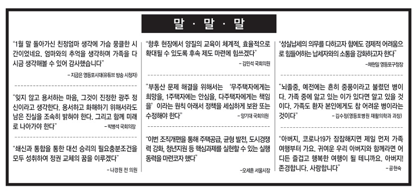 “대선에서는 당이 주도해서 미래 비전을 제시해 달라. 당•정•청이 하나로 대한민국의 미래를 위해 목표를 제시하고 정책 마련에 힘써 달라” -문재인 대통령 “1월 말 돌아가신 친정엄마 생각에 가슴 뭉클한 시간이었네요. 엄마와의 추억을 생각하며 가족을 다시금 생각해볼 수 있어 감사했습니다” -지금은 영등포시대(유튜브 방송 시청자) “잊지 않고 용서하는 마음, 그것이 진정한 광주 정신이라고 생각한다. 용서하고 화해하기 위해서라도 남은 진실을 조속히 밝혀야 한다. 그리고 함께 미래로 나아가야 한다” -박병석 국회의장 “쇄신과 통합을 통한 대선 승리의 필요충분조건을 모두 성취하여 정권 교체의 꿈을 이루겠다” -나경원 전 의원 “향후 현장에서 양질의 교육이 체계적, 효율적으로 확대될 수 있도록 후속 제도 마련에 힘쓰겠다” -김민석 국회의원 “부동산 문제 해결을 위해서는 ‘무주택자에게는 희망을, 1주택자에는 안심을, 다주택자에게는 책임을’이라는 원칙 아래서 정책을 세심하게 보완 또는 수정해야 한다” -양기대 국회의원 “이번 조직개편을 통해 주택공급, 균형 발전, 도시경쟁력 강화, 청년지원 등 핵심과제를 실현할 수 있는 실행동력을 마련코자 했다” -오세훈 서울시장 “성실납세의 의무를 다하고자 함에도 경제적 어려움으로 힘들어하는 납세자와의 소통을 강화하고자 한다” -채현일 영등포구청장 “영등포청은 제대로 된 주민공청회를 통해 주민의 행복추구권, 지역의 균형 발전, 효율성, 교통환경평가 등을 충분히 고려해 메낙골 지구단위계획안을 확정하고 개발하라는 주민의 목소리에 귀 기울여야 한다” -차인영 영등포구의회 의원 “뇌졸중, 예전에는 흔히 중풍이라고 불렸던 병이다. 가족 중에 앓고 있는 이가 있다면 알고 있을 것이다. 가족도 환자 본인에게도 참 어려운 병이라는 것이다” -김수정(영등포병원 재활의학과 과장) “아버지 코로나19가 잠잠해 지면 제일 먼저 가족 여행부터 가요. 귀여운 우리 아버지와 함께라면 어디든 즐겁고 행복한 여행이 될 테니까요. 아버지! 존경합니다. 사랑합니다” -공현숙