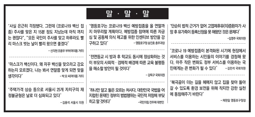 -신각현 조용우 부부(여의동 거주) “마스크가 백신이다. 왜 자꾸 백신을 맞으라고 강요하는지 모르겠다. 나는 봐서 연말쯤 맞게 되면 맞을 생각이다” -박 모 씨(여의동 거주) “영등포구는 코로나19 백신 예방접종을 올 연말까지 마무리할 계획이다. 예방접종 참여에 따른 자긍심 및 공동체 의식 제고를 위한 인센티브 방안을 강구하고 있다” -영등포구청 송진호 총무과장 “전면등교 시 방과 후 학교도 동시에 정상화하는 것이 부모의 사회적·경제적 배경에 따른 교육 불평등을 해소할 방안이 될 것이다” -강득구 국회의원 “하나만 알고 둘은 모르는 처사다. 대한민국 국법을 어지럽힌 문재인 정부의 범법행위는 국민적 저항에 부딪히고 말 것이다” -국민의힘 전주해 대변인 “단순히 법적 근거가 없어 고엽제후유(의)증환자가 사망 후 유가족이 등록신청을 못 해왔던 것은 문제다” -김영주 국회의원 “코로나 19 예방접종이 본격화된 시기에 현장에서 서비스를 이용하는 시민들의 이야기를 경청해 왔다. 아주 작은 변화도 정부 서비스를 이용하는 국민에게는 큰 변화가 될 수 있다” 김민석 국회의원 “북극곰이 더는 길을 헤매지 않고 집을 찾아 돌아갈 수 있도록 환경 보전을 위해 작지만 강한 실천에 동참해주기 바란다” -채현일 영등포구청장 “미국 과학자들은 대체로 비타민D의 효용성이 인정되고 있다고 보고 있으며, 어떻게 섭취해야 할지 팁도 제시하고 있다” -손진희 영등포병원 내과 센터장 김용석 의원은 “주택가격 상승 등으로 서울시 25개 자치구의 재정불균형은 날로 더 심화되고 있다” -김용석 서울시 의원 “올해 들어 처음 하는 사업인데 영일시장 상인들이 많이 좋아했다. 쓰레기를 함부로 버리지 않았으면 좋겠다” -김미자 문래동 자원봉사연합회 회장