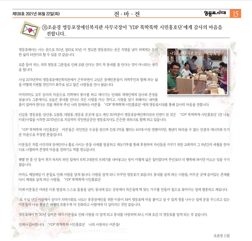 영등포에서는 사는 곳으로 30년, 일터로 10년. 이 정도면 영등포라는 곳은 지명을 넘어 저에게는 온전한 삶의 터전이라 할 수 있을 것 같습니다. 요즘 들어 저는, 저의 영등포 그분들로 인해 오랜 산다는 것이 꼭 동네를 잘 안다는 것이 아니라는 생각을 합니다. 사실 2011년부터 영등포장애인복지관에서 근무하면서 고심은 장애인분들이 지역주민과 함께 하는 삶을 어떻게 지원할 것인가가 화두로 삼고 많은 사람들을 만나 왔습니다. 아직까지도 모두 감사의 마음으로 지역에서 봉사를 하고 계시기는 단체와 개개인에게 감사와 존경을 보냅니다. 그중에서도 오늘은 동네를 안다는 것은 사람을 아는 것이고, 사람을 알기 위해서는 내어줄 품이 있어야 한다는 것을 깨우처 주신 나의 친애하는 어른들 ‘YDP 뚝딱뚝딱 시민홍호단’에게 영등포시대를 통해 감사의 마음을 전합니다. 신길동, 영등포동, 당산동, 도림동, 대림동...영등포 곳곳에 살고 계신 30여분이 영등포장애인복지관과 인연이 된 것은 ‘YDP 뚝딱뚝딱 시민홍호단’(전 나눔이웃)사업을 시작한 2013년으로 지금까지 국민연금공단 영등포지사도 든든한 파트너로 함께 하고 있습니다. ‘YDP 뚝딱뚝딱 시민홍호단’ 어른들은 국민연금 수급을 받으며 인생 2막을 펼치는 60대 이상 연령이지만, 청년이 따라올 수 없는 만큼의 에너지와 뜨거운 마음으로 무장된 분들입니다. 이분들은 직접 사각지대 장애인이나 홀로 사시는 분들 사례를 발굴하고 재능기부를 통해 후원하며 자신들을 키우기 위한 교육까지 그 9년간의 세월을 한마디로 나열하여 존경의 마음을 전하기도 벅찰 정도입니다. 햇볕 한 줌 안 들어 쥐가 독차지 하던 집에서 트럭 2대분의 쓰레기를 내어놓고는 방이 이렇게 넓은 집이었다며 주인보다 더 행복해 하시던 미소는 잊을 수가 없습니다. 아직도 매일매일 이 분들로 인해 사람을 알게 됩니다. 사람을 알게 되니 자꾸만 영등포가 보입니다. 동네를 살게 하는 사람들, 어두운 곳에 숨어있는 존재를 다시 제대로 살게 하는 사람들, ‘YDP 뚝딱뚝딱 시민홍호단’ 이제 이분들은 어려운 이웃 발굴과 스스로 돌봄을 넘어, 동네에 있는 공방에서 작은집에 딱 맞는 가구를 만들어 집으로 찾아가는 일에 열중하고 계십니다. 또 수십 년간 시설에서 살다가 지역사회로 나오는 중증장애인을 위한 이웃이 되어 영등포에 마음 붙이고 살 수 있게 정을 나누는 일에 문을 두드리고 있는 이분들의 나눔 활동은 세월이 흐를수록 더 진화하고 사람에게 더 깊어지는 것만 같습니다. 영등포에서 한 30년 살아본 제가 이분들로 인해 사람을 더 알게 되고 동네를 사랑하게 되니, 이제 조금 더 영등포를 알게 되는 것 같습니다 . 언제나 감사합니다. ‘YDP 뚝딱뚝딱 시민홍호단’ 나의 사랑하는 어른들!