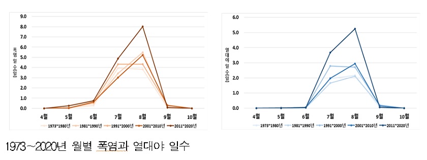 폭염과 열대야는 과거와 비교해 발생 빈도가 상승한 경향에 있지만, 최근 10년은 폭염 14.0일, 열대야 9.0일로 발생 빈도가 많이 상승한 것으로 나타났다.