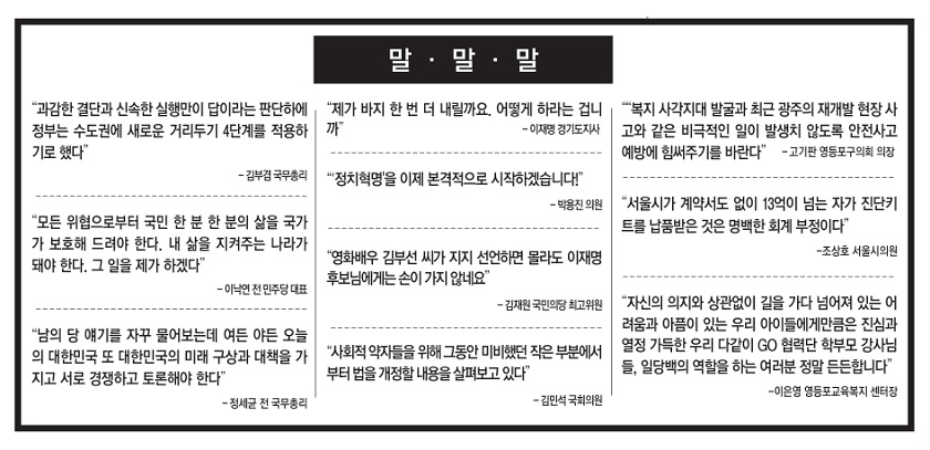 -김부겸 국무총리 “모든 위협으로부터 국민 한 분 한 분의 삶을 국가가 보호해 드려야 한다. 내 삶을 지켜주는 나라가 돼야 한다. 그 일을 제가 하겠다” -이낙연 전 민주당 대표 “제가 바지 한 번 더 내릴까요. 어떻게 하라는 겁니까” -이재명 경기도지사 “남의 당 얘기를 자꾸 물어보는데 여든 야든 오늘의 대한민국 또 대한민국의 미래 구상과 대책을 가지고 서로 경쟁하고 토론해야 한다” -정세균 전 국무총리 “정치혁명’을 이제 본격적으로 시작하겠습니다!” -박용진 의원 “영화배우 김부선 씨가 지지 선언하면 몰라도 이재명 후보님에게는 손이 가지 않네요” -김재원 국민의당 최고위원 “사회적 약자들을 위해 그동안 미비했던 작은 부분에서부터 법을 개정할 내용을 살펴보고 있다” -김민석 국회의원 “입법 독재 민주당은 국민의 알 권리에 재갈을 물리려는 행태를 단념하라” -강민국 국민의힘 대변인 “복지 사각지대 발굴과 최근 광주의 재개발 현장 사고와 같은 비극적인 일이 발생치 않도록 안전사고 예방에 힘써주기를 바란다” -고기판 영등포구의회 의장 “서울시가 계약서도 없이 13억이 넘는 자가 진단키트를 납품받은 것은 명백한 회계 부정이다” -조상호 서울시의원 “시장 업무 보고 내용의 22.1%는 2021년 본예산에 편성되지 않은 것이었다” -김호평 시의원 “앞으로 지속해서 구정 현안을 공유할 수 있는 소통의 장을 마련하겠다” -채현일 영등포구청장 “바자회를 할 때마다 장학재단에 장학금을 기부한다는 데 행복함을 느낀다” -김미순 영등포구 여성연합회장 “서울시를 비롯한 공공기관들이 제발 이상한 외국 용어를 남발하지 않았으면 좋겠다. ‘서울런’이라는 이름도 필자가 교육의원 시절 대표 발의해 통과시킨 ‘국어 바르게 쓰기’ 조례 위반이다” -김형태 교육을바꾸는새힘 대표 자신의 의지와 상관없이 길을 가다 넘어져 있는 어려움과 아픔이 있는 우리 아이들에게만큼은 진심과 열정 가득한 우리 다같이 GO 협력단 학부모 강사님들, 일당백의 역할을 하는 여러분 정말 든든합니다. -이은영 영등포교육복지 센터장-