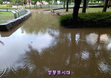7월 19일 오후 한때 쏟아진 소나기로 인해 문래공원 일부가 물에 잠겨있다.