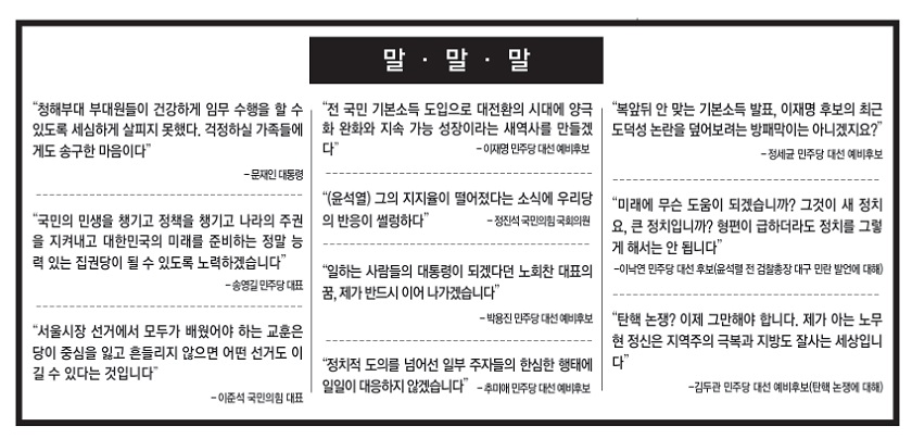 -문재인 대통령 “국민의 민생을 챙기고 정책을 챙기고 나라의 주권을 지켜내고 대한민국의 미래를 준비하는 정말 능력 있는 집권당이 될 수 있도록 노력하겠습니다” -송영길 민주당 대표 “서울시장 선거에서 모두가 배웠어야 하는 교훈은 당이 중심을 잃고 흔들리지 않으면 어떤 선거도 이길 수 있다는 것입니다” -이준석 국민의힘 대표 “전 국민 기본소득 도입으로 대전환의 시대에 양극화 완화와 지속 가능 성장이라는 새역사를 만들겠다” -이재명 민주당 대선 예비후보” “앞뒤 안 맞는 기본소득 발표, 이재명 후보의 최근 도덕성 논란을 덮어보려는 방패막이는 아니겠지요?” -정세균 민주당 대선 예비후보 “미래에 무슨 도움이 되겠습니까? 그것이 새 정치요, 큰 정치입니까? 형편이 급하더라도 정치를 그렇게 해서는 안 됩니다” -이낙연 민주당 대선 후보(윤석렬 전 검찰총장의 대구 민란 발언에 대해) “일하는 사람들의 대통령이 되겠다던 노회찬 대표의 꿈, 제가 반드시 이어 나가겠습니다” -박용진 민주당 대선 예비후보 “탄핵 논쟁? 이제 그만해야 합니다. 제가 아는 노무현 정신은 지역주의 극복과 지방도 잘사는 세상입니다” -김두관 민주당 대선 예비후보(탄핵 논쟁에 대해) “정치적 도의를 넘어선 일부 주자들의 한심한 행태에 일일이 대응하지 않겠습니다” -추미애 민주당 대선 예비후보 “윤석열) 그의 지지율이 떨어졌다는 소식에 우리당의 반응이 썰렁하다” -정진석 국민의힘 국회의원
