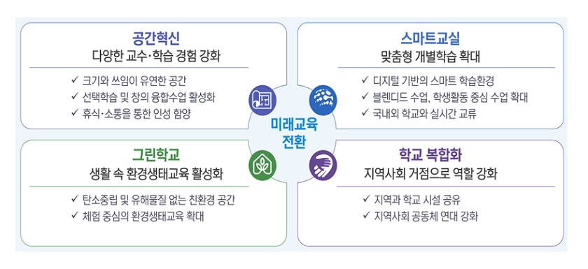 그린스마트 미래학교 사업은 40년 이상 경과한 학교 건물을 개축하거나 새 단장(리모델링)하는 사업이다. 서울시교육청은 2021년부터 2025년까지 총 사업비 3조 2천억원(교육부0.97조 원, 교육청2.26조 원)을 투입하여 공간 혁신, 그린 학교, 스마트 교실, 복합화 등을 핵심요소로 미래교육과정에 능동적으로 대응할 수 있는 총 213교의 미래형 학교를 조성할 예정이다. 이를 위해 서울시교육청은 40년 이상 경과된 학교를 대상으로 건물 노후도, 안전등급, 내진보강, 석면 보유 현황 등과 더불어 고교학점제, 온라인 콘텐츠 활용 등 각종 교육정책 목적 사업에 적합한 학교를 우선 선정했다.