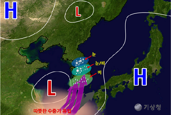 최근 포근했던 날씨에서 평년 수준(최저기온 : -12~4도, 최고기온 : 2~9도)으로 기온이 갑자기 떨어져 추워질 것으로 내다봤다. 한편 3일(일) 늦은 오후부터는 서쪽에서 다가오는 저기압의 영향으로 중부 서해안에 눈 또는 비가 시작되겠고, 밤에는 그 밖의 전국으로 점차 확대되겠다. 이번 강수는 상대적으로 기온이 높은 남부지방(산지 제외)에서는 비로 내리겠지만, 중부 대부분 지방에서는 눈 또는 진눈깨비로 내리겠고, 4일(월) 오전 서해안부터 점차 갠다. 기상청은 3일(일)~4일(월)은 중부지방의 기온이 눈과 비의 경계가 되는 0도 안팎에 머물러, 기온이 예상보다 높은 지역에서는 강수형태가 진눈깨비 대신 비로 내릴 가능성이 있고, 같은 강수량이라 하더라도 비로 내리는 경우에는 적설이 예상보다 줄어들 수 있으니, 앞으로 발표되는 최신 기상정보를 적극 참고하시기 바란다고 밝혔다. 3일(일) 늦은 밤~4일(월) 아침에는 저기압으로부터 다량의 수증기가 유입되면서 강수가 집중되겠고, 특히 서울을 비롯한 중부지방과 경북북부지방에서는 많은 눈 또는 비가 내리면서 4일(월) 아침 출근길 교통에 지장을 줄 가능성이 있을 것이라며 앞으로 발표되는 최신 기상정보를 적극 참고하기 바란다고 전했다. 또한 4일(월) 새벽에는 비가 내리는 곳에서도 충북과 경북 내륙 등 지상의 기온이 낮게 유지되는 지역을 중심으로 내리는 비가 지면에 얼어붙어 빙판길을 이루는 곳이 많겠으니, 보행과 교통안전에 유의를 당부했다. 당분간 우리나라 주변 기압계 흐름이 빠른 가운데 기압골이 통과하면서 눈 또는 비가 자주 내릴 것으로 예상되며, 5일(화) 오후~6일(수) 오전에도 또 한 차례 기압골이 지나면서 전국에 눈 또는 비가 오겠으며 6일(수) 오후부터는 북서쪽에서 찬 대륙고기압이 강하게 확장하면서 기온이 큰 폭으로 떨어지고 바람이 강하게 불어 추워질 것으로 예보했다.