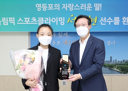 채현일 영등포구청장은 12일 오후 클라이밍 천제 서채현 선수에게 국위 선양과 영등포구를 빛낸 공에 감사를 표하며 꽃다발과 감사패를 전했다. 이어서 영등포구 장학재단에서는 서채현 선수를 2021학년도 특기 지정장학생으로 선발하고 장학증서와 함께 장학금을 전달했다. 채현일 구청장은 “지친 구민들에게 위로와 희망을 준 것에 대단히 감사하다”라며 “영등포구는 내년에 있을 아시안게임과 2024년 파리올림픽에서 더 큰 성과를 낼 수 있도록 관심과 성원을 보내겠다”고 밝혔다.