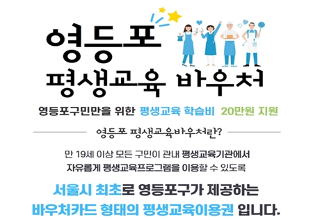 영등포구가 서울시 자치구 최초로 9월부터 시행할 예정인 ‘영등포 평생교육바우처’ 사업에 참여할 신청자를 8월 17일부터 31일까지 모집한다. 이번에 시행하는 바우처 사업은 올 12월 말까지 총 2,500명의 구민을 지원하는 시범사업으로 운영된다.
