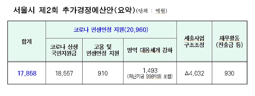 첫째, 정부와 시가 지급하는 ‘코로나 상생 국민지원금’ 신속집행을 위해 1조 8,557억 원(국비 1조4,761억 원, 시비 3,796억 원)을 편성했다.(*구비 2,530억 원 매칭 별도) ‘코로나 상생 국민지원금’은 코로나19 장기화로 직‧간접 피해를 입은 서울시민을 위로하고 생활안전망을 확보하기 위한 것으로, 1인당 25만 원을 지원한다. 지원대상은 건강보험료 기준 가구소득 하위 80% 가구와 별도 특례기준이 적용되는 맞벌이 및 1인 가구다. 둘째, 코로나 4차 대유행으로 생계절벽에 직면한 취약계층의 고용 및 민생안정에 910억 원을 지원한다. 코로나로 새롭게 생겨난 취약계층이 돌봄에서 소외되는 일이 없도록 생계급여 등 지원대상을 늘리고, 일자리 1만1천개를 새롭게 제공한다. 소상공인‧자영업자 매출 확대를 위해 ‘서울사랑상품권’을 2,500억 원 규모로 추가 발행한다. 셋째, 코로나19 4차 대유행 확산세를 차단하고 피해를 최소화하기 위한 방역체계 강화에도 나선다. 서울시 재난관리기금에 추가로 998억 원을 적립해 생활치료센터 운영, 서울광장 임시 선별진료소 연장·운영, 자가격리자 물품지원 사업 등에 활용한다. 격리입원 치료비, 격리자 생활지원비 등 방역활동 지원을 위한 예산도 495억 원 편성했다. 서울시는 추경재원 확보를 위하여 기금 등 가용 가능한 모든 재원을 최대한 활용하는 동시에, 기존 사업에 지장이 없는 범위 내에서 세출사업 구조조정을 단행해 필요한 재원을 마련했다고 밝혔다.
