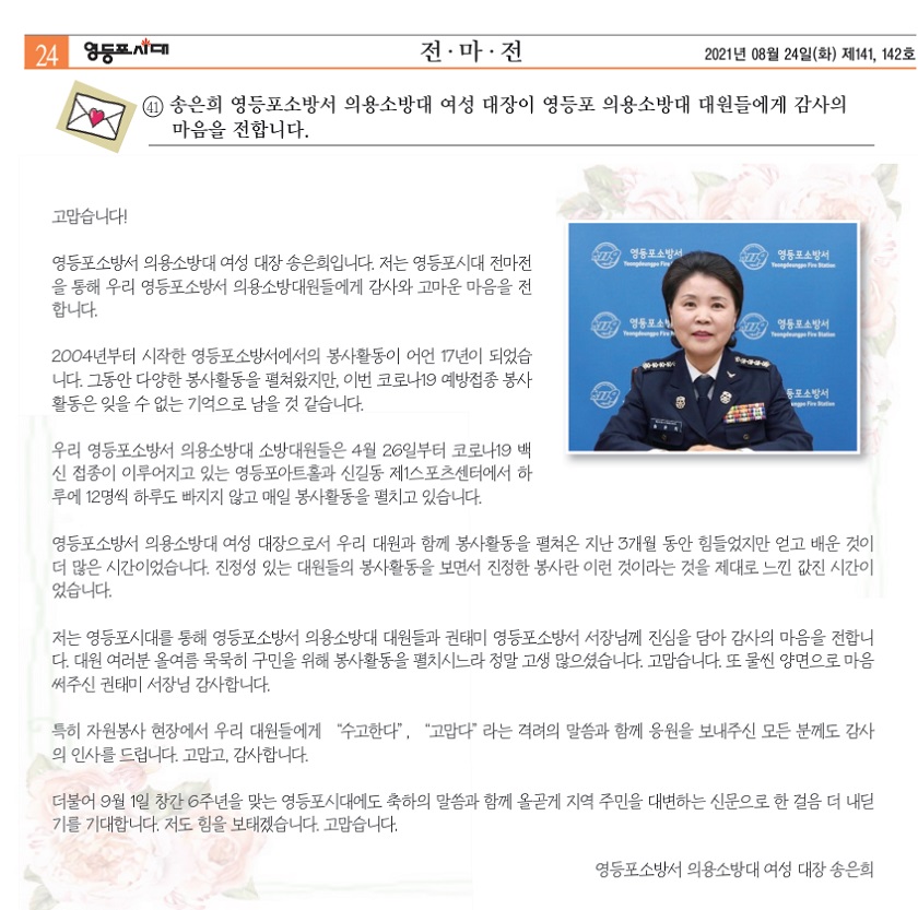 고맙습니다! 영등포소방서 의용소방대 여성 대장 송은희입니다. 저는 영등포시대 전마전을 통해 우리 영등포소방서 의용소방대원들에게 감사와 고마운 마음을 전합니다. 2004년부터 시작한 영등포소방서에서의 봉사활동이 어언 17년이 되었습니다. 그동안 다양한 봉사활동을 펼쳐왔지만, 이번 코로나19 예방접종 봉사활동은 잊을 수 없는 기억으로 남을 것 같습니다. 우리 영등포소방서 의용소방대 소방대원들은 4월 26일부터 코로나19 백신 접종이 이루어지고 있는 영등포아트홀과 신길동 제1스포츠센터에서 하루에 12명씩 하루도 빠지지 않고 매일 봉사활동을 펼치고 있습니다. 영등포소방서 의용소방대 여성 대장으로서 우리 대원과 함께 봉사활동을 펼쳐온 지난 3개월 동안 힘들었지만 얻고 배운 것이 더 많은 시간이었습니다. 진정성 있는 대원들의 봉사활동을 보면서 진정한 봉사란 이런 것이라는 것을 제대로 느낀 값진 시간이었습니다. 저는 영등포시대를 통해 영등포소방서 의용소방대 대원들과 권태미 영등포소방서 서장님께 진심을 담아 감사의 마음을 전합니다. 대원 여러분 올여름 묵묵히 구민을 위해 봉사활동을 펼치시느라 정말 고생 많으셨습니다. 고맙습니다. 또 물심 양면으로 마음 써주신 권태미 서장님 감사합니다. 특히 자원봉사 현장에서 우리 대원들에게 “수고한다”, “고맙다”라는 격려의 말씀과 함께 응원을 보내주신 모든 분께도 감사의 인사를 드립니다. 고맙고, 감사합니다. 더불어 9월 1일 창간 6주년을 맞는 영등포시대에도 축하의 말씀과 함께 올곧게 지역 주민을 대변하는 신문으로 한 걸음 더 내딛기를 기대합니다. 저도 힘을 보태겠습니다. 고맙습니다. 영등포소방서 의용소방대 여성 대장 송은희