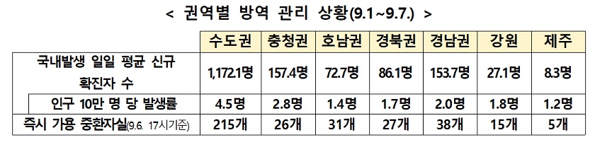 한편 코로나19 중앙재난안전대책본부에 따르면 9월 7일(화) 0시 기준으로 9월 1일부터 9월 7일까지 1주일 동안 코로나19 국내 발생 환자는 11,743명이며, 1일 평균 환자 수는 1,677.6명으로 나타났다. 수도권 환자는 1,172.1명으로 8월 25일부터 8월 31일에 비해 54.4명 증가했고 비수도권은 505.4명으로 65.6명이 감소했다. 정부는 선제 적인 진단검사를 확대하여 적극적으로 환자를 찾고, 역학조사를 통한 추적과 격리하는 등 강화된 방역 대응을 유지하고 있다. 9월 6일에도 전국의 선별진료소를 통해 5만 1669건, 임시 선별검사소를 통해 11만 4,242건의 검사가 이루어졌다.
