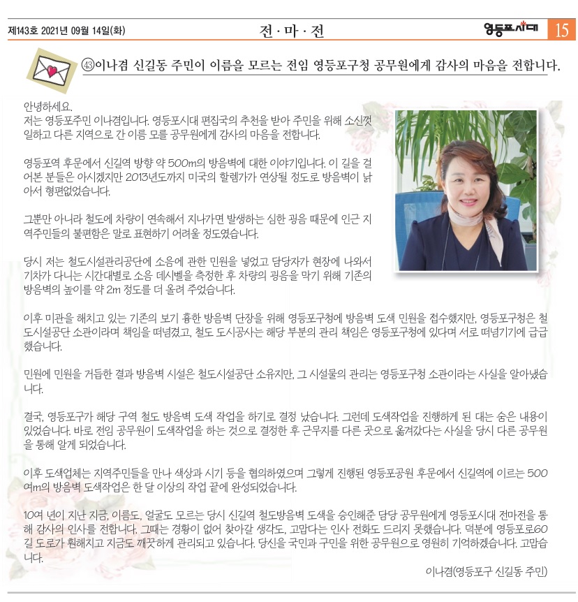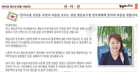 저는 영등포주민 이나겸입니다. 영등포시대 편집국의 추천을 받아 주민을 위해 소신껏 일하고 다른 지역으로 간 이름 모를 공무원에게 감사의 마음을 전합니다. 영등포역 후문에서 신길역 방향 약 500m의 방음벽에 대한 이야기입니다. 이 길을 걸어본 분들은 아시겠지만 2013년도까지 미국의 할렘가가 연상될 정도로 방음벽은 벗겨진 도색 등 낡아서 형편없었습니다. 그뿐만 아니라 철도에 차량이 연속해서 지나가면 발생하는 심한 굉음 때문에 인근 지역주민들의 불편함은 말로 표현하기 어려울 정도였습니다. 그러나 어떻게 해결해야 할지 몰라 망연자실한 인근 주문들은 굉음에 시달려야 했습니다. 당시 저는 철도시설관리공단에 소음에 관한 민원을 넣었고 담당자가 현장에 나와서 기차가 다니는 시간대별로 소음 데시벨을 측정한 후 차량의 굉음을 막기 위해 기존의 방음벽의 높이를 약 2m 정도를 더 올려 주었습니다. 이후 미관을 해치고 있는 기존의 보기 흉한 방음벽 단장을 위해 영등포구청에 방음벽 도색 민원을 접수했지만 영등포구청은 철도시설공단 소관이라며 책임을 떠넘겼고 철도 도시공사는 해당 부분의 관리 책임은 영등포구청에 있다며 서로 떠넘기기에 급급했습니다. 당시 방음벽의 미관은 고장 난 가로등과 겹쳐 마치 난민들이 거주하는 동네 같은 분위기를 자아냈습니다. 민원에 민원을 거듭 낸 결과 방음벽 시설은 철도시설공단 소유지만, 그 시설물의 관리는 영등포구청 소관이라는 결론을 얻어냈습니다. 결국, 영등포구가 해당 구역 철도 방음벽 도색 작업을 하는 것으로 결정 났다는 소식을 구청 공무원을 통해 전해 들었습니다. 그런데 영등포구청이 이 구간에 대한 도색작업을 진행하게 된 대는 숨은 내용이 있었습니다. 바로 전임 공무원이 도색작업을 하는 것으로 결정한 후 근무지를 다른 곳으로 옮겨갔다는 사실을 당시 다른 공무원을 통해 알게 되었습니다. 이후 도색업체는 지역주민들을 만나 색상과 시기 등을 협의하였으며 그렇게 진행된 영등포공원 후문에서 신길역에 이르는 500여m의 방음벽 도색작업은 한 달 이상의 작업 끝에 완성되었습니다. 10여 년이 지난 지금, 이름도, 얼굴도 모르는 당시 신길역 철도방음벽 도색을 승인해준 담당 공무원에게 영등포시대 전마전을 통해 감사의 인사를 전합니다. 그때는 경황이 없어 찾아갈 생각도, 고맙다는 인사 전화도 드리지 못했습니다. 덕분에 영등포로60길 도로가 훤해지고 지금도 깨끗하게 관리되고 있습니다. 당신을 국민을, 구민을 위한 공무원으로 영원히 기억하겠습니다. 고맙습니다. 이나겸(영등포구 신길동 주민)-143호 전마전