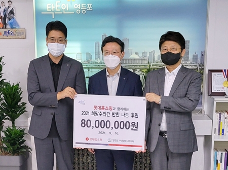 이날 영등포구사회복지협의회에서 열린 기부금 전달식에는 채현일 영등포구청장, 박영준 영등포사회복지협의회장, 신성빈 롯데홈쇼핑 본부장 등이 참석했다. 전달된 8천만원은 지역 내 저소득층 주민을 위해 사용될 예정이다. 이번 행사는 영등포지역 사회공헌활동인 희망수라간 활동의 하나로 진행되었으며 롯데홈쇼핑은 또 코로나19로 방역의 최 일선에서 고군분투하는 선별진료소 의료진 및 방역 관계자들을 격려하기 위해 비타민, 마사지건, 다리 순환 패치 등으로 구성된 응원 키트도 함께 전달했다. 롯데홈쇼핑은 수년간 영등포지역 내 어려운 저소득층을 후원해 오고 있으며, 특히 코로나 발생 이후 작년 10월 언택트바자회(이불 및 의류)에 2억 4천만원 상당, 올해 3월 온라인 바자회에 1억8천만원 상당 총 4억2천만원의 후원 품을 영등포구사회복지협의회에 전달했다. 롯데홈쇼핑 관계자는 “경제적 어려움으로 고통받는 어려운 이웃들을 위해 더 많은 힘을 보태겠다”고 밝혔다. 박영준 영등포구사회복지협의회 회장은 롯데홈쇼핑에 감사의 마음을 전하고 “우리 지역사회에 따스한 손길이 필요로 하는 어려운 이웃들을 더 발굴해 온정이 넘치는 지역사회를 만드는 데 최선을 다하겠다”고 밝혔다.