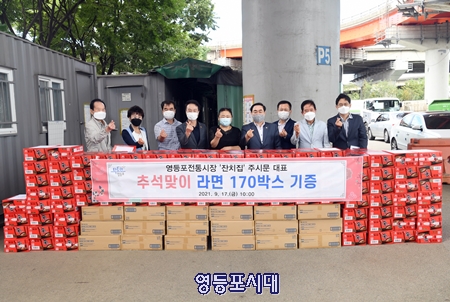 9월 17일 추석 명절(9월 21일)을 맞이해 양평동 자원 순환센터에서 영등포구 환경미화원들에게 라면 170박스를 기증한 영등포시장 ‘잔치집’ 주시문 대표가 밝힌 소감이다. 영등포시장에서 ‘잔치집’을 운영하는 주시문 대표는 17일 추석 명절을 맞이해 양평동 자원 순환센터에서 영등포구 환경미화원들에게 감사의 인사와 함께 라면 170박스를 기증했다. 이날 기부식에는 김정태 시의원, 이규선 구의원과 영등포구청 관계자 등이 참석했다. 주시문 대표는 2019년부터 설과 추석 명절을 앞두고 노고가 많은 관내 환경미화원들에게 매년 물품을 기부하며 나눔 문화 확산에 기여하고 있다.