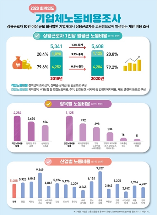 2020년 상용근로자 1인당 월평균 노동비용은 5백 4십만 8천원으로 전년도 5백 34만 1천원 대비 1.3% 증가한 것으로 나타났다. 직접 노동비용 0.8%, 간접 노동비용 3.2% 증가한 것으로 조사됐다. 2020년도는 코로나19 영향으로 ‘숙박 및 음식점업’(-4.7%), ‘예술, 스포츠와 여가 관련 서비스업’(-2.7%), ‘운수 및 창고업’(-2.6%) 등은 감소한 것으로 조사됐다. 코로나19에 취약한 대면서비스업의 노동비용 감소는 대부분 직접 노동비용 감소에 기인하나, ‘운수 및 창고업’은 직접 및 간접 노동비용 모두 감소한 것으로 나타났다. 고용노동부가 발표한 상용근로자 10인 이상 기업 중 회사법인(약 3,500개)을 대상으로 조사한 기업체 노동비용 조사 결과에 따르면 이같이 나타났다. 이번 조사는 상용근로자 10인 이상인 회사법인 기업체에서 상용근로자를 고용함으로써 발생하는 제반 비용을 종합적으로 파악하기 위해서 시행됐다. 전체적으로 보면 2020회계연도 상용근로자 10인 이상 기업체의 상용근로자 1인당 월평균 노동비용은 5,408천원으로 전년 대비 1.3% 증가했다. 노동비용 중 79.2%를 차지하는 직접 노동비용(임금총액, 4백28만 4천원)은 전년 대비 0.8% 증가, 간접 노동비용(1백 12만 5천원)은 3.2% 증가한 것으로 나타났다. 2020년 직접노동비용 상승률 둔화에는 코로나19 영향으로 상여금 및 성과급 감소, 숙박·음식점업, 예술·스포츠 등의 정액·초과급여 감소 등이 작용한 것으로 보인다. 간접 노동비용은 코로나19 확산으로 채용·교육훈련비는 감소하였으나 퇴직연금 연간적립액, 사회보험료 등 법정 노동비용과 법정 외 복지비용 증가로 3.2% 상승한 것으로 조사됐다. 산업별로는 ‘금융 및 보험업’ 9백 82만 7천원(+7.1%), ‘전기, 가스, 증기 및 공기조절 공급업’ 9백 16만 9천원(-0.4%), ‘정보통신업’ 6백 12만 4천원(+2.3%) 순으로 높으며, ‘사업시설관리, 사업지원 및 임대 서비스업’ 2백 96만 2천원(+6.2%)이 가장 낮았다. ‘금융 및 보험업’은 2020년 실적 호조로 은행 등이 포함된 ‘금융업’(1천 58만 6천원), 증권사 등이 포함된 ‘금융 및 보험 관련 서비스업’(9백 15만 8천원)이 높게 나타났다. 코로나19 영향으로 ‘숙박 및 음식점업’(-4.7%), ‘예술, 스포츠와 여가 관련 서비스업’(-2.7%), ‘운수 및 창고업’(-2.6%) 등은 노동비용이 감소한 것으로 조사됐다. 특히 코로나19에 취약한 산업인 ‘예술, 스포츠와 여가 관련 서비스업’, ‘숙박 및 음식점업’ 등은 직접 노동비용이 감소했고 ‘운수 및 창고업’」은 직접·간접 노동비용 모두 감소한 것으로 나타났다. 규모별로는 ‘300인 미만’ 기업체의 1인당 월평균 노동비용은 4백55만 6천원으로 전년 대비 2.9% 증가했고, ‘300인 이상’은 6백 47만 7천원으로 0.3% 감소했다. ‘300인 미만’ 노동비용은 ‘300인 이상’의 70.3%로 전년(68.2%)보다 규모 간 차이가 2.2%p 축소된 것으로 조사됐다. 항목별로 살펴본 직접 노동비용은 상용근로자 1인당 월평균 4백 28만 4천원으로 전년 대비 0.8% 증가했다. 정액 급여 및 초과급여는 3백 63만원으로 전년보다 3.1% 증가했고 상여금 및 성과급은 65만 4천원으로 전년보다 10.6% 감소했다. 간접 노동비용은 상용근로자 1인당 월평균 1백 12만 5천원으로 전년 대비 3.2%(+3만5천원), 간접 노동비용 항목 중 퇴직급여 등의 비용(+1,500원), 법정 노동비용(+1,600원), 법정 외 복지비용(+10,000원)은 증가했고 교육 훈련 비용(-6천원), 채용 관련 비용(-1천원)은 감소했다. 항목별 법정 외 복지비용 중 ‘기타’에는 사내근로복지기금 출연금, 우리사주제도 지원금, 보육지원금, 경조비, 피복비, 전근 이사지원비 등이 포함됐다.