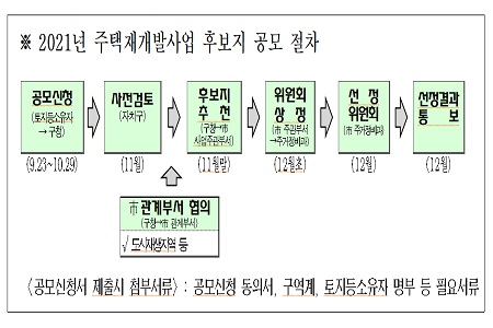 주택공급 활성화를 위한 오세훈 시장의 ‘재개발 활성화 6대 규제완화 방안’이 적용되는 첫 민간재개발 후보지 공모다. 서울시는 ‘재개발 활성화 6대 규제완화 방안’ 추진을 위한 이행 준비와 제도개선이 마무리 됨에 따라 ‘2021 주택재개발사업 후보지 공모’를 23일(목)부터 10월29일(금)까지(37일간) 시행하고 12월 중 25개 내외의 최종 후보지를 선정해 발표할 계획이다. 6대 방안에 따라 그간 정비구역 지정의 진입장벽으로 작용했던 ‘주거정비지수제’가 폐지돼 그동안 재개발 기회가 없었던 낙후된 지역도 신청 기회를 얻게 될 전망이다. 사업 추진과정에서 주민 동의 절차는 3번→2번으로 간소화된다. 최종 선정되는 후보지는 ‘신속통합기획’을 통해서 공공이 신속한 구역지정 절차를 지원한다. 아파트 건립시 2종 7층 관련 규제도 완화될 예정으로 사업성도 크게 개선될 것으로 기대된다. 서울시는 민간재개발 후보지 선정을 위해 공모제를 처음으로 도입했다. ‘주거정비지수제’ 폐지로 구역지정 요건을 충족하는 대상지가 대거 늘어남에 따라 기존 수시접수 방식을 정기 공모(연1회) 방식으로 보완해 무분별한 정비사업을 방지한다는 계획이다. 시는 법적요건인 노후도 등 구역별 평가를 중심으로 후보지를 선정하되, 자치구별 여건과 추진의지, 구별 안배 등을 종합적으로 고려할 계획이다. 공모에 참여할 수 있는 대상지는 ▲법령‧조례상 재개발 정비구역지정 요건에 맞고 ▲토지등소유자 30% 이상 구역지정을 희망하는 지역으로, 이 두 가지 요건을 모두 충족해야 한다. 재개발 구역지정을 위한 법적요건은 필수항목(노후도 동수 2/3 이상, 구역면적 1만㎡ 이상)을 충족하고 선택항목(노후도 연면적 2/3 이상, 주택접도율 40% 이하, 과소필지 40% 이상, 호수밀도 60세대/ha 이상) 중 1개 이상을 충족하면 된다. 다만, 50% 이상 동의를 받아 추진하는 ‘주거환경개선사업지역’은 30%가 아닌 50% 이상 동의를 받아야 신청 가능하다. 작년 공공재개발 후보지 공모에서 제외됐던 도시재생지역등과 서울시 정책상 도시관리 및 보전이 필요한 지역(특별경관지구, 역사문화환경 보존지역 등)도 공모대상에 포함시켰다. 노후화‧슬럼화되고 기반시설이 너무 열악한 주거지는 재개발 사업으로 실질적인 주거환경 개선이 이뤄질 수 있도록 문을 여는 것이다. 다만, 이들 구역은 자치구 사전검토 단계에서 자치구가 시 관계부서, 국토부, 문화재청 등과 사전협의를 거친 후, 협의결과를 반영해 후보지 추천 여부를 결정하게 된다. 시는 사전 협의절차가 있는 만큼 주민들의 신중한 신청을 당부한다고 설명했다. 시는 지난 6월 「2세대 도시재생」을 통해 보존에 치우쳐있던 도시재생의 한계를 극복하기 위해 재개발 등 개발‧정비를 포함하는 방향으로 도시재생 패러다임을 대전환, 실질적인 주거환경 개선효과를 유도하겠다고 발표한 바 있다. 또한 시는 주민 혼선을 최소화하기 위해 공모 제외 대상도 마련했다. 앞서 6월 ‘서울시-국토교통부 정책협력 간담회’에서 발표한대로 공공재개발과 2.4대책(3080+)에 따른 후보지로 선정된 곳은 상충방지 원칙에 따라 제외된다. 토지등소유자 30% 이상이 반대하는 구역, 전용주거지역도 제외된다. 공모에 참여하고자 하는 구역은 해당 자치구에 공모신청서와 동의서 등 관련 서류를 제출하면 된다. 11월 중 자치구 사전검토를 통해 25개 자치구별로 4곳 이내로 서울시에 추천하면 시가 12월 중 ‘선정위원회’를 열어 후보지를 최종 선정한다. 자치구는 시가 마련한 ‘구역별 평가’ 내용에 따라 해당 구역의 정비구역 지정요건 충족여부, 구역계의 적정성, 정량적 평가(표), 관계부서 협의결과 등을 검토·작성 후, 민간재개발 공모에 적합하다고 판단되는 구역을 4곳 이내로 시에 추천한다. 서울시는 도시계획‧건축‧법률 등 외부 전문가를 포함해 구성되는 ‘선정위원회’를 통해, 자치구에서 검토하여 제출한 자료를 바탕으로 노후도 등 물리적 여건을 반영한 정량적 평가점수와 자치구 여건, 구역의 정책적 요건, 구별 안배 및 주택가격 동향 등을 종합 고려해 최종 후보지를 선정한다. 자치구 여건 및 구역의 정책적 요건은 구별 노후저층주거지 현황, 주택수급계획, 현재 진행 중인 아파트 개발계획, 주택 가격상승률 등과 함께 공공재개발에서 제시한 정책적 요건 등이다. 서울시는 연내 민간 재개발 후보지가 선정되면, 작년 1차 공공재개발 공모에 이어 2차 공공재개발 공모를 추진할 계획이다. 민간재개발 공모에서 탈락(미선정)한 구역은 2차 공공재개발 공모에 참여할 수 있다. 민간재개발 후보지로 선정된 구역은 공공재개발 공모에 중복신청이 불가하다. 아울러, 「재개발 활성화 6대 규제완화 방안」과 함께 투기세력 유입 차단을 위해 발표한 “재개발구역 투기방지 대책”도 병행할 계획이다. 재개발구역 지정을 위한 후보지를 공모할 때는 공모 공고일을 ‘권리산정기준일’로 고시한다. 이를 통해 공모 공고일 이후 투기세력의 분양권 취득을 위한 다세대 신축 등 지분쪼개기를 원천 차단한다. 후보지 선정 후 : 분양권이 없는 비경제적인 신축행위를 제한하는 건축허가 제