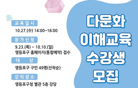 이렇듯 지역 내 외국인 주민 수가 갈수록 증가함에 따라 다문화 사회 속 다양성을 서로 존중하고 함께 더불어 살아가기 위한 사회 분위기 조성이 요구되고 있다. 이에 영등포구는 다문화 사회의 이해와 인식개선을 위해 지역 주민과 공무원, 청소년․다문화 시설 종사자를 대상으로 10월 27일과 28일 영등포구청 별관 강당에서 이틀간 다문화 이해 교육’을 진행한다. 이번 교육은 내•외국인 주민이 함께하는 다문화 이해 교육을 마련하여 구민과 직원, 시설 종사자들의 다문화 감수성을 증진하고 글로벌 의식 함양을 도모하기 ‘그림자도 차별하실 건가요?’를 주제로 ▲지금은 다문화시대 ▲다문화시대의 인권 ▲다문화가족 수용성 등을 다룰 예정이다. 특히 ‘블랑카’라는 캐릭터로 인기를 끌었던 개그맨이자 현재는 다문화 전문강사로 활발히 활동 중인 정철규 씨가 강의를 도맡아, 다양한 사례와 퀴즈 참여를 통해 더욱더 쉽고 재미있게 다문화에 대한 이해를 도울 예정이다. 교육 수강을 희망하는 주민은 영등포구청 홈페이지 내 통합예약 사이트를 통해 9월 23일부터 10월 10일까지 온라인 접수하면 된다. 교육 대상자는 총 49명 선착순으로 모집한다. 다만 사회적 거리두기 단계에 따라 교육 방법이나 일정, 인원이 변동될 수 있다.