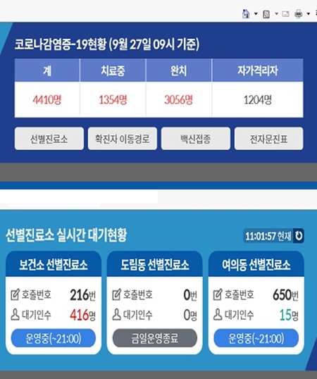 한편 영등포구가 운영 중인 선별진료소 3곳 중 도림동 선별진료소는 금일 운영이 종료되었으며 보건소 선별진료소 대기인 수는 416명(호출 번호 216), 여의동 선별진료소는 대기인 수 15명(호출 번호 650번)으로 보건소 선별진료소와 비교하면 대기인 수가 훨씬 적어 빨리 검사를 받을 수 있다. (11시 01분 57초 현재) 코로나19로 인한 사망자는 총 2,456명(전국)이며 서울은 633명이다. (9월 27일 0시 기준)