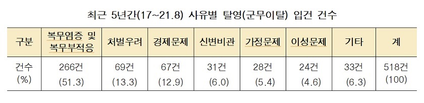 최근 5년간 군에서 병사·부사관·장교 등 총 518건의 탈영이 입건된 것으로 확인됐다. 탈영 사유로는 ‘복무 염증과 복무 부적응’에 의한 탈영이 266건, 51.3%로 절반 이상인 것으로 나타났다.