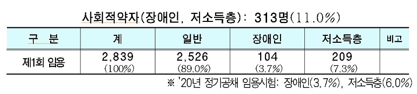 간호, 보건 등 감염병 대응 인력(410명)에 대해서는 자치구 코로나 현장 인력 격무 해소를 위해 채용 일정을 단축하여 7월 30일 자로 조기 발표한 바 있다. 2,839명 중 행정직군은 2,020명, 기술직군은 819명이다.