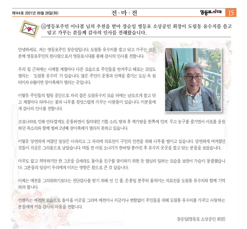 안녕하세요. 저는 영등포주민 장순일입니다. 도림동 유수지를 쓸고 닦고 가꾸는 모든 분께 영등포주민의 한사람으로서 영등포시대를 통해 감사의 인사를 전합니다. 우리 집 근처에는 사계절 계절마다 다른 모습으로 주민들을 반겨주고 때로는 모임도 열리는 ‘도림동 유수지’가 있습니다. 많은 주민이 운동과 산책을 즐기는 도심 속 쉼터이자 6월이면 장미축제가 열리는 곳입니다. 이렇듯 주민들의 힐링 공간으로 자리 잡은 도림유수지 모습 뒤에는 남모르게 쓸고 닦고 계절마다 피어나는 꽃과 나무를 정성스럽게 가꾸는 사람들이 있습니다. 이분들에게 감사의 인사를 전합니다. 코로나19로 인해 안타깝게도 운동하면서 질러대던 기합 소리, 방과 후 책가방을 한쪽에 던져 두고 농구를 즐기면서 서로를 응원하던 목소리와 함께 벌써 2년째 장미축제가 열리지 못하고 있습니다. 이렇듯 당연하게 여겼던 일상은 사라지고 그 자리에 의료진이 구민의 안전을 위해 사투를 벌이고 있습니다. 당연하게 여겨졌던 것들이 지금은 그리움으로 남았습니다. 며칠 전 아침 소나기가 한바탕 쏟아진 후 유수지 곳곳을 쓸고 닦는 분들을 보았습니다. 아무도 없고 적막하기만 한 그곳을 금세라도 돌아올 친구를 맞이하기 위한 듯 열심히 일하는 모습을 보면서 가슴이 뭉클했습니다. 그분들의 일상이 우리에게 미치는 영향은 참으로 큰 것 같습니다. 이제는 예전을 그리워하기보다는 진단검사를 받기 위해 선 긴 줄, 온종일 분주히 움직이는 의료진을 도림동 유수지와 함께 기억하려 합니다. 언젠가는 예전의 모습으로 돌아올 이곳을 그리며 예전이나 지금이나 변함없이 주민들을 위해 도림동 유수지를 가꾸고 사랑하는 분들에게 거듭 감사의 마음을 전합니다. 144호 전마전-2021년 9월 28일 발행