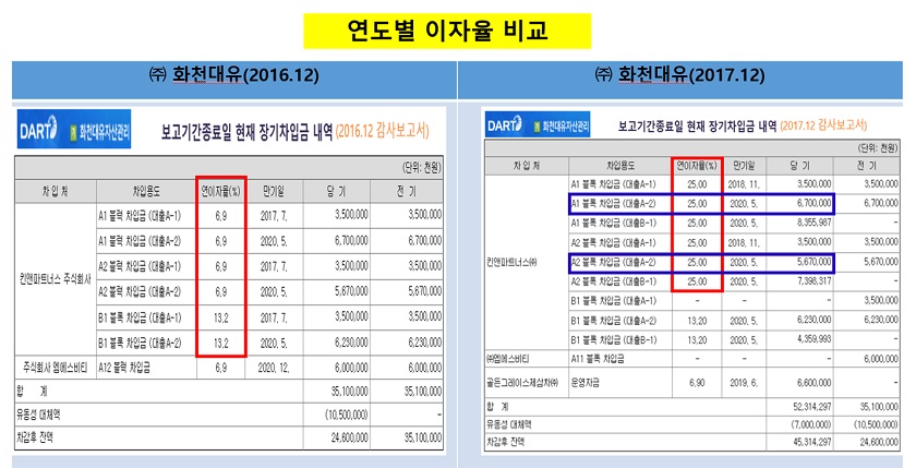 국회 기획재정위원회 국민의힘 류성걸 의원은 10월 8일, 기재위 국세청 감사에서 ㈜화천대유와 관련 “국세청은 지난 4월부터 고액의 현금이 수시로 입출금된다는 보고를 받는 것으로 알려졌다”며 “이에 대한 세무조사를 실시해야 한다”라고 주장했다. 국세청은 개별 납세 정보라는 이유로 ㈜화천대유 관련 정보를 국회에 일체 제출을 거부하고 있는 것으로 알려진 가운데 류성걸 의원은 금융감독원 ‘전자 공시시스템(DART)’을 통해 확보한 감사보고서를 중심으로 횡령, 수상한 자금거래 등 의심 정황에 대해 조목조목 지적했다. 먼저, 류 의원은 “㈜화천대유의 2016년 12월 감사보고서와 2017년 감사보고서의 이율이 비정상적으로 차이(6.9% vs 25%)가 난다”라며 “특히, 만기가 도래하지 않은 두 건 대출은 2016년도엔 6.9%의 연이자를 지급하다가 2017년엔 18.1%p 인상한 25%를 지급한 이유에 대해 의문스럽다”고 말했다. 또 류 의원은 “돈을 빌려준 회사와 돈을 빌려 간 회사의 감사보고서상의 이자율이 서로 다르다”며, “이자 비용의 차액 연 4.1억원의 행방에 대해서도 살펴봐야 한다”고 주장했다. 한편 류 의원이 제시한 ‘킨앤파트너스(주)’의 감사보고서에는 ㈜천화동인 4호가 등장해 궁금증을 불러일으켰다. ㈜천화동인 4호는 미국으로 출국한 남욱 변호사가 대주주로 있으며, 1,000억원의 배당금을 챙겨간 것으로 알려졌다. 세 번째로 ㈜화천대유 감사보고서(2018.12)에 따르면, 2018년 총 21건의 장기차입금 중 NH농협은행과 ㈜에이치엠지의 차입금 이자가 터무니없이 높다고 주장했다. 실제 2건의 제외한 나머지 대여금의 경우 4.25~4.75%의 이자로 제1금융권 대출을 받는 상황에서 굳이 18%와 24%의 높은 이자율을 준 것은 횡령이 의심스럽다며 문제를 제기했다.