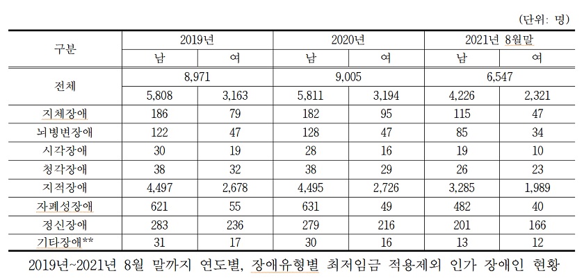 한편 2020년 기준 장애유형별 최저임금 적용제외 장애인 노동자 현황을 보면, 지적장애 노동자가 7,221명으로 전체 80.2%를 차지했으며, 이어 자폐성장애 노동자 680명(7.6%), 정신장애 495명(5.5%) 순으로 나타났다.