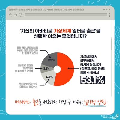 서울시민 65.1%는 출근방식을 선택할 수 있다면, 현실세계 일터보다 메타버스로 출근하고 싶은 것으로 나타났다. 서울시 여성능력개발원에서는 미래사회에 달라질 근로형태와 고부가가치 미래일자리에 대한 인식 파악을 위해 SNS를 통해 설문조사를 실시하고 그 결과를 18일(월) 발표했다. 설문조사 결과 ‘자신의 아바타로 가상세계 일터로 출근’을 선택한 응답자(65.1% 2,916명)가 ‘본인이 직접 현실세계 일터로 출근’을 선택한 응답자(34.9% 1,560명)보다 30.2% 많았다. ‘자신의 아바타로 가상세계 일터로 출근’을 선택한 이유로는 ‘가상세계에서 근무하면서 동시에 현실세계(집안일, 육아 등)도 돌볼 수 있어서’가 53.1%(1,549명)로 가장 많았다. 반면, 직접 현실세계로 출근하겠다고 응답한 사람들은 대면 의사소통에 대한 선호(41%, 639명)를 주된 원인으로 꼽았다. 실제로 메타버스를 경험해 본 적이 있냐는 질문에는 58.2%(2,603명)가 ‘경험한 적 있다’고 답했다. 가장 많이 경험해본 콘텐츠는 ‘게임 콘텐츠(73.3%, 1,908명)’였다. 메타버스로 주목받고 있는 미래직업 중 가장 관심 있는 분야는 ‘게임 개발자 및 메타버스 서비스 개발자’가 45.2%(2,024명)로 1위를 차지했다.