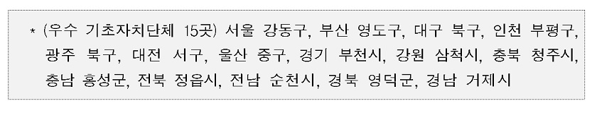 기초자치단체의 경우 세종, 제주를 제외한 15개 광역자치단체가 관내 우수한 기초자치단체를 직접 평가하였으며 아래와 같이 각 1곳이 선정됐다.