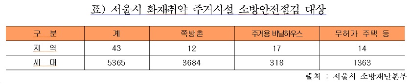 서울시 소방재난본부는 화재 취약 주거시설이 밀집된 쪽방촌 등 43개 지역 내 총 5365세대를 대상으로 긴급 소방 안전 검검을 추진한다고 22일(금) 밝혔다.