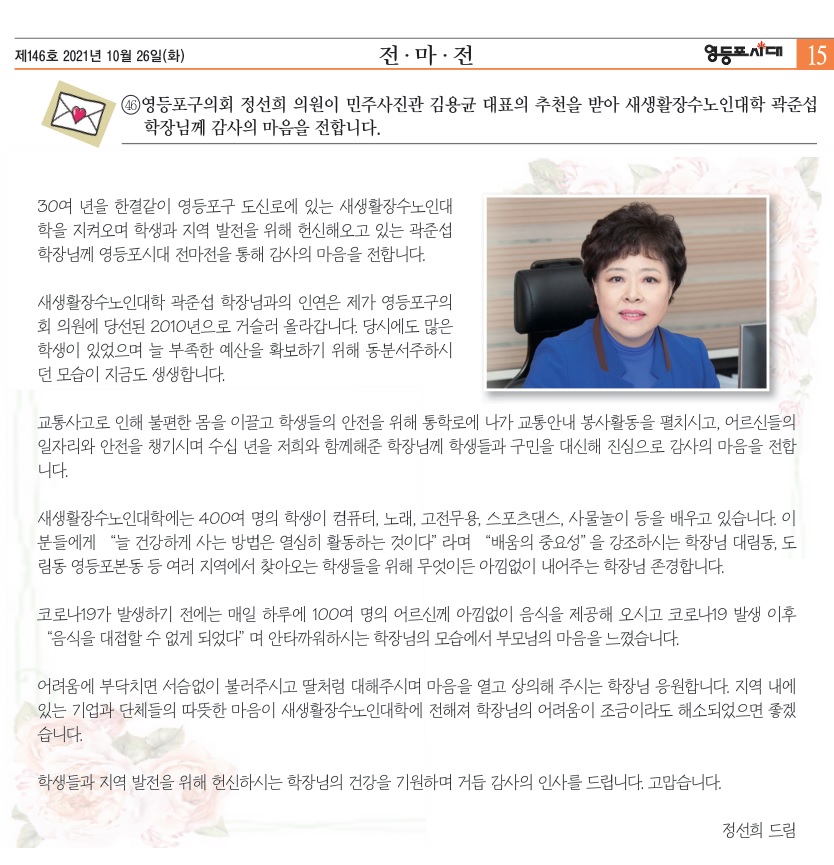 30여 년을 한결같이 영등포구 도신로에 있는 새생활장수노인대학을 지켜오며 학생과 지역 발전을 위해 헌신해오고 있는 곽준섭 학장님께 영등포시대 전마전을 통해 감사의 마음을 전합니다. 새생활장수노인대학 곽준섭 학장님과의 인연은 제가 영등포구의회 의원에 당선된 2010년으로 거슬러 올라갑니다. 당시에도 많은 학생이 있었으며 늘 부족한 예산을 확보하기 위해 동분서주하시는 모습이 지금도 생생합니다. 교통사고로 인해 불편한 몸을 이끌고 학생들의 안전을 위해 통학로에 나가 교통안내 봉사활동을 펼치시고, 어르신들의 일자리와 안전을 챙기시며 수십 년을 저희와 함께해준 학장님께 학생들과 구민을 대신해 진심으로 감사의 마음을 전합니다. 새생활장수노인대학에는 400여 명의 학생이 컴퓨터, 노래, 고전무용, 스포츠댄스, 사물놀이 등을 배우고 있습니다. 이분들에게 “늘 건강하게 사는 방법은 열심히 활동하는 것이다”라며 “배움의 중요성”을 강조하시는 학장님 대림동, 도림동 영등포본동 등 여러 지역에서 한결같이 찾아오는 학생들을 위해 무엇이든 아낌없이 내어주는 학장님 존경합니다. 코로나19가 발생하기 전에는 매일 하루에 100여 명의 어르신께 아낌없이 음식을 제공해 오시고 코로나19 발생 이후 “음식을 대접할 수 없게 되었다”며 안타까워하시는 학장님의 모습에서 부모님의 마음을 느꼈습니다. 어려움에 부닥치면 서슴없이 불러주시고 딸처럼 대해주시며 마음을 열고 상의해 주시는 학장님 응원합니다. 지역 내에 있는 기업과 단체들의 따뜻한 마음이 새생활장수노인대학에 전해져 학장님의 어려움이 조금이라도 해소되었으면 좋겠습니다. 학생들과 지역 발전을 위해 헌신하시는 학장님의 건강을 기원하며 거듭 감사의 인사를 드립니다. 고맙습니다. 정선희 드림
