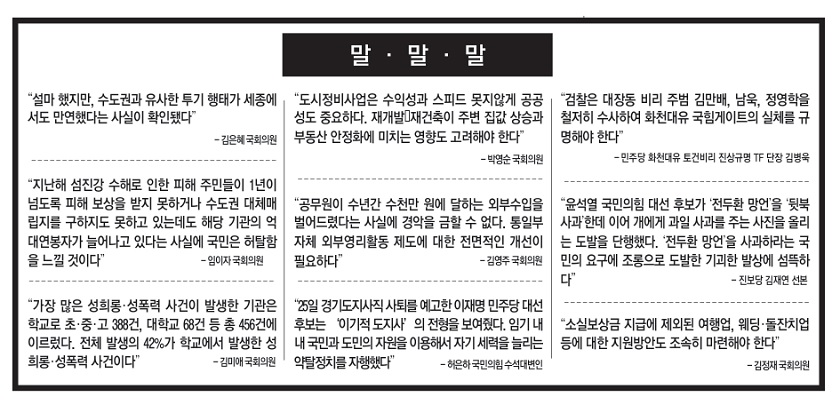 -김은혜 국회의원 “지난해 섬진강 수해로 인한 피해 주민들이 1년이 넘도록 피해 보상을 받지 못하거나 수도권 대체매립지를 구하지도 못하고 있는데도 해당 기관의 억대연봉자가 늘어나고 있다는 사실에 국민은 허탈함을 느낄 것이다” -임이자 국회의원 “소실보상금 지급에 제외된 여행업, 웨딩·돌잔치업 등에 대한 지원방안도 조속히 마련해야 한다” 김정재 국회의원 “도시정비사업은 수익성과 스피드 못지않게 공공성도 중요하다. 재개발‧재건축이 주변 집값 상승과 부동산 안정화에 미치는 영향도 고려해야 한다” -박영순 국회의원 “공무원이 수년간 수천만 원에 달하는 외부수입을 벌어드렸다는 사실에 경악을 금할 수 없다. 통일부 자체 외부영리활동 제도에 대한 전면적인 개선이 필요하다” -김영주 국회의원 “25일 경기도지사직 사퇴를 예고한 이재명 민주당 대선후보는 ‘이기적 도지사’의 전형을 보여줬다. 임기 내내 국민과 도민의 자원을 이용해서 자기 세력을 늘리는 약탈정치를 자행했다” -허은하 국민의힘 수석대변인 “검찰은 대장동 비리 주범 김만배, 남욱, 정영학을 철저히 수사하여 화천대유 국힘게이트의 실체를 규명해야 한다” -민주당 화천대유 토건비리 진상규명 TF 단장 김병욱 “윤석열 국민의힘 대선 후보가 ‘전두환 망언’을 ‘뒷북 사과’한데 이어 개에게 과일 사과를 주는 사진을 올리는 도발을 단행했다. ‘전두환 망언’을 사과하라는 국민의 요구에 조롱으로 도발한 기괴한 발상에 섬뜩하다” -진보당 김재연 선본 “가장 많은 성희롱·성폭력 사건이 발생한 기관은 학교로 초·중·고 388건, 대학교 68건 등 총 456건에 이르렀다. 전체 발생의 42%가 학교에서 발생한 성희롱·성폭력 사건이다” -김미애 국회의원