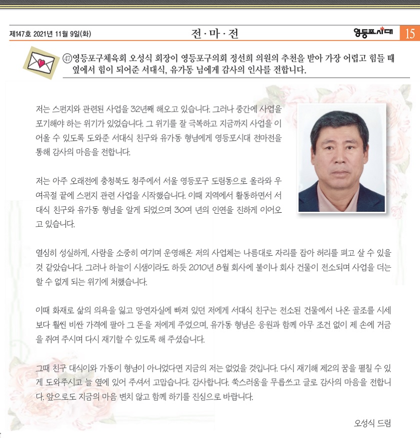 저는 스펀지와 관련된 사업을 32년째 해오고 있습니다. 그러나 중간에 사업을 포기해야 하는 위기가 있었습니다. 그 위기를 잘 극복하고 지금까지 사업을 이어올 수 있도록 도와준 서대식 친구와 유가동 형님에게 영등포시대 전마전을 통해 감사의 마음을 전합니다. 저는 아주 오래전에 충청북도 청주에서 서울 영등포구 도림동으로 올라와 우여곡절 끝에 스펀지 관련 사업을 시작했습니다. 이때 지역에서 활동하면서 서대식 친구와 유가동 형님을 알게 되었으며 30여 년의 인연을 진하게 이어오고 있습니다. 열심히 성실하게, 사람을 소중히 여기며 운영해온 저의 사업체는 나름대로 자리를 잡아 허리를 펴고 살 수 있을 것 같았습니다. 그러나 하늘이 시샘이라도 하듯 2010년 8월 회사에 불이나 회사 건물이 전소되며 사업을 더는 할 수 없게 되는 위기에 처했습니다. 이때 화재로 삶의 의욕을 잃고 망연자실에 빠져 있던 저에게 서대식 친구는 전소된 건물에서 나온 골조를 시세보다 훨씬 비싼 가격에 팔아 그 돈을 저에게 주었으며, 유가동 형님은 응원과 함께 아무 조건 없이 제 손에 거금을 쥐여 주시며 다시 재기할 수 있도록 해 주셨습니다. 그때 친구 대식이와 가동이 형님이 아니었다면 지금의 저는 없었을 것입니다. 다시 재기해 제2의 꿈을 펼칠 수 있게 도와주시고 늘 옆에 있어 주셔서 고맙습니다. 감사합니다. 쑥스러움을 무릅쓰고 글로 감사의 마음을 전합니다. 앞으로도 지금의 마음 변치 않고 함께 하기를 진심으로 바랍니다. 오성식 드림