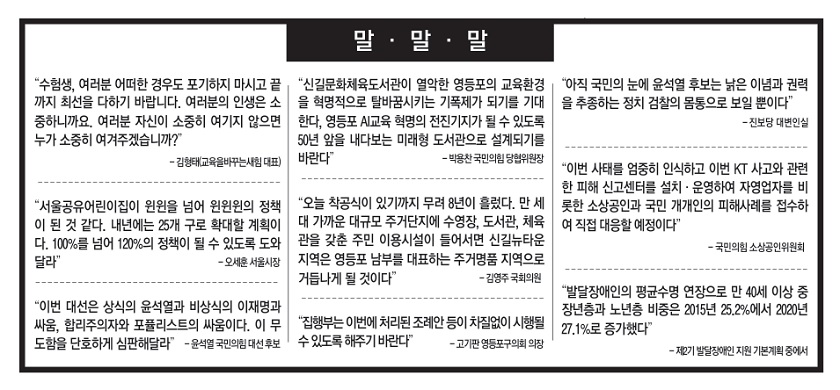 -김형태(교육을바꾸는새힘 대표) “서울공유어린이집이 윈윈을 넘어 윈윈윈의 정책이 된 것 같다. 내년에는 25개 구로 확대할 계획이다. 100%를 넘어 120%의 정책이 될 수 있도록 도와달라” -오세훈 서울시장 “어린이집 간 공유를 하고 나니 아이들은 다양한 친구를 사귈 수 있어 좋아하고, 원장은 공동구매로 운영비가 절약되어 좋아한다. 교사들은 다양한 접근법으로 교육프로그램을 이해하게 되었고 부모들은 어린이집 프로그램에 참여할 기회가 많아졌다” -양평동 공유어린이집 관계자 “오늘 착공식이 있기까지 무려 8년이 흘렀다. 만 세대 가까운 대규모 주거단지에 수영장, 도서관, 체육관을 갖춘 주민 이용시설이 들어서면 신길뉴타운 지역은 영등포 남부를 대표하는 주거명품 지역으로 거듭나게 될 것이다” -김영주 국회의원 “신길문화체육도서관이 열악한 영등포의 교육환경을 혁명적으로 탈바꿈시키는 기폭제가 되기를 기대한다, 영등포 AI교육 혁명의 전진기지가 될 수 있도록 50년 앞을 내다보는 미래형 도서관으로 설계되기를 바란다” -박용찬 국민의힘 당협위원장 “집행부는 이번에 처리된 조례안 등이 차질없이 시행될 수 있도록 해주기 바란다” -고기판 영등포구의회 의장 “이번 대선은 상식의 윤석열과 비상식의 이재명과 싸움, 합리주의자와 포퓰리스트의 싸움이다. 이 무도함을 단호하게 심판해달라” -윤석열 국민의힘 대선 후보 “아직 국민의 눈에 윤석열 후보는 낡은 이념과 권력을 추종하는 정치 검찰의 몸통으로 보일 뿐이다” -진보당 대변인실 “이번 사태를 엄중히 인식하고 이번 KT 사고와 관련한 피해 신고센터를 설치·운영하여 자영업자를 비롯한 소상공인과 국민 개개인의 피해사례를 접수하여 직접 대응할 예정이다” -국민의힘 소상공인위원회 “시민 안전과 관련된 비용 전부를 수급인에게 전가하는 것은 안전 확보에 앞장서야 할 서울시가 사설 업자에게 책임을 떠넘기는 것이다. 이 같은 관행이 매년 지적받음에도 불구하고 반복되는 것은 타성에 젖은 행정이다” -김창원 시의원 “발달장애인의 평균수명 연장으로 만 40세 이상 중장년층과 노년층 비중은 2015년 25.2%에서 2020년 27.1%로 증가했다” -제2기 발달장애인 지원 기본계획 중에서 (147호 11월 9일 발행/배포 말말말)