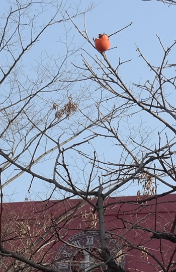 먹을거리도 부족한 판에 감은 양식으로도 충분했었고 아무리 해도 닿을 수 없는 감은 남겨둘 수밖에 없었을 겁니다. 사람이 못 먹으니 날짐승 차지가 되었을 테지요. 까치밥, 그리되었을 겁니다. 어떤 선한 사람들의 생각으로 가지마다 몇 개씩은 남겨두었고 사람들이 따라 해서 까치밥, 그리되었을 겁니다. 영등포공원에도 까치밥이 곳곳에 남겨있습니다.