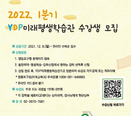 영등포구가 내년 1월 10일부터 3월 31일까지 진행되는 YDP미래평생학습관의 2022년 1분기 프로그램에 참여할 수강생을 선착순 모집한다.